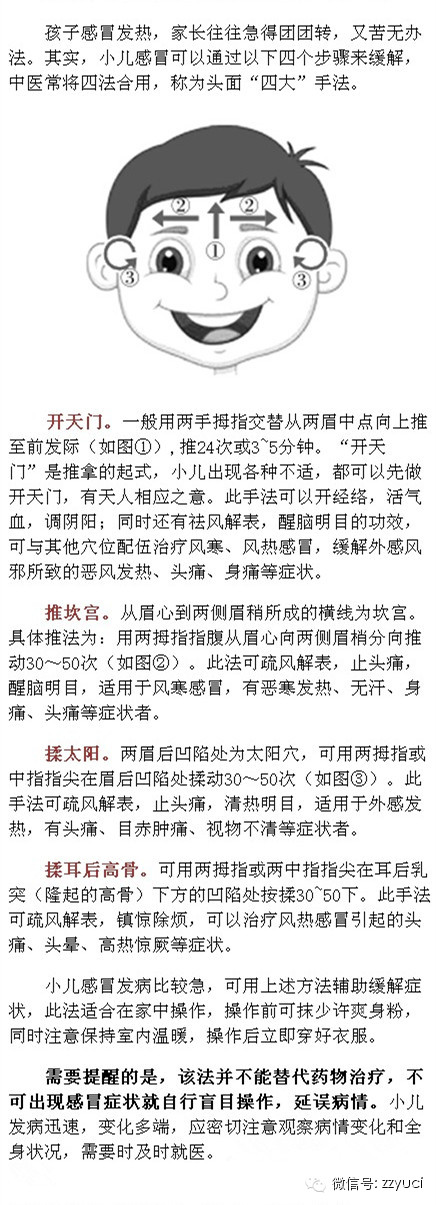 孩子感冒发烧,家长往往急得团团转,又苦没有办法帮孩子缓解发烧带来的不适。豫慈国医堂张主任介绍,小儿感冒可以通过按摩四个穴位来缓解,中医常将四法合用,称为头面“四大”手法。爸爸妈妈们快来学习一下,以备不时之需吧。