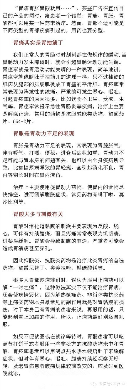 “胃痛胃胀胃酸就用……”,某些广告在宣传自己的产品的同时,给患者一个错觉:胃痛、胃胀、胃酸都可以用同一种药来治疗。豫慈健康向您指出,胃部不适可能是不同的胃部疾病引起的,用药也要分类型。赶快看看如何给你的胃对症下药吧!